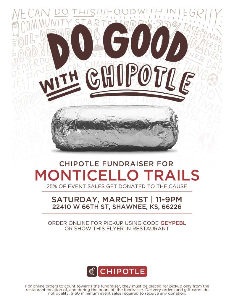 After our winter hiatus during the cold weather, our next restaurant fundraiser is all day on Saturday 3/1 at Chipotle with 25% back on participating revenue, when supporters use our code or show the flyer in store!