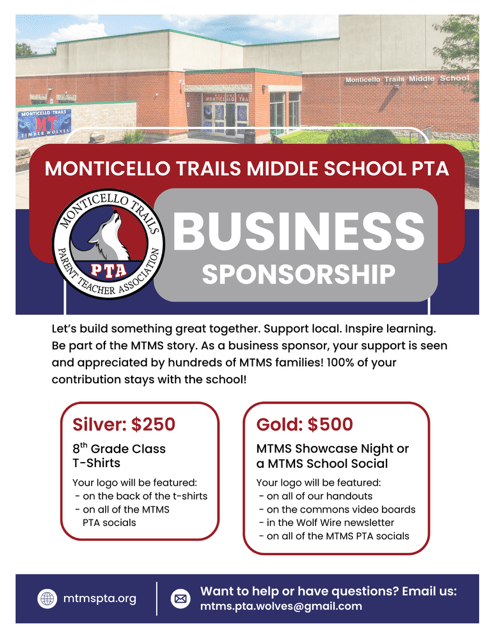 At Monticello Trails Middle School, we believe in strong community partnerships. When your business supports the MTMS PTA, you’re investing directly in student success, teacher innovation, and school-wide engagement.
